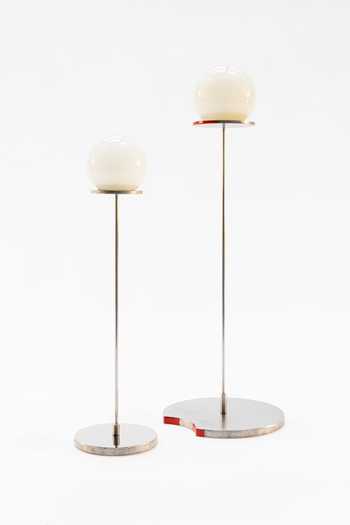 Marianne Baibay – 2024 – pièce unique – acier inox et verre opalin – 5 x 5 x 19 cm et 8 x 8 x 23 cm